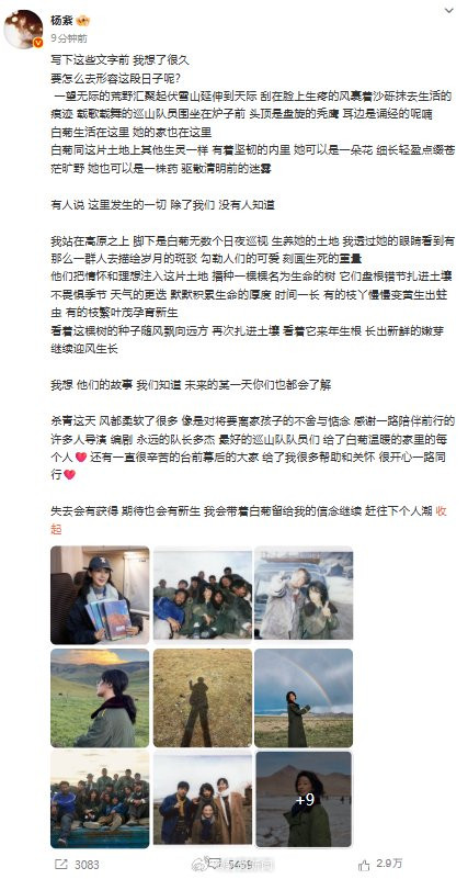 [#杨紫发文暂别白菊#]#杨紫说会带着白菊的信念继续前行#10月31日,《生命树》杀青,演员@杨紫发文暂别白菊:“杀青这天,风都柔软了很多,像是对将要离家孩子的不舍与惦念,感谢一路陪伴前行的许多人,导演、编剧、永远的队长多杰、最好的巡山队队员们,给了白菊温暖的家里的每个人。还有一直很辛苦的台前幕后的大家,给了我很多帮助和关怀,很开心一路同行。失去会有获得,期待也会有新生,我会带着白菊留给我的信念继续,赶往下个人潮。”#杨紫[超话]#